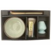 Souprava se skládá z kameninové misky - Chawan, bambusové lžičky na čaj matcha - Chashaku, bambusová metličky - Chasen a keramického stojánku na metličku Chasen.